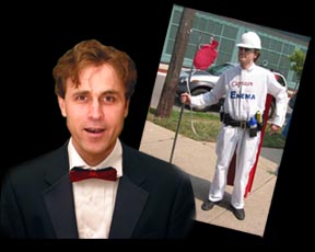 Kevin - comedian, super-hero, healthcare provider, ordained minister and manager of Monty’s Grill Age: 29 Goals: saving the world through colonic irrigation Fantasies/Fetishes: no explanation needed Aliases: Captain Enema, Dr. Teletightassapoulos, Rev. Cletus Tithemore Web site: www.captainenema.com |