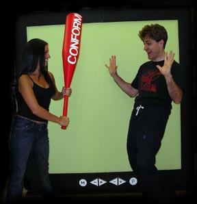 Kim - dance, choreography and conformity Occupation: Professional Dominatrix Alias: Baroness von Hauen Skills: Proficient with riding crop, whip, breadboard and canoe paddle. Awards: The prestigious “Most Agonizing Wedgy Award”, BDSM Convention, Anaheim, 2000. Multilingual: Knows the phrase “You Naughty Boy” in over 72 languages. Political Activist: Republican National Commitee ....“The real Sadists” |